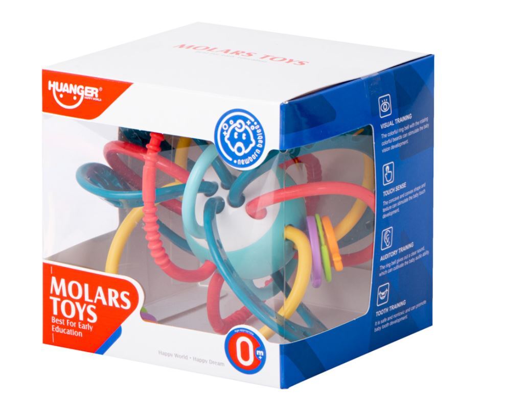 Spalvingas barškutis vaikams. Atneša palengvėjimą dantų dygimo metu.