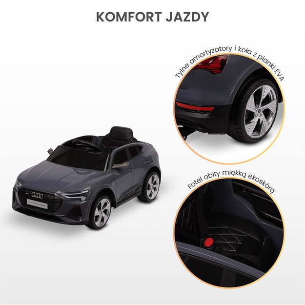 Audi E-tron Sportback - tai "Toyz" licencijuotas akumuliatorinis automobilis, kuriame derinamas elegantiškas dizainas ir elektrinės pavaros dinamiškumas. Modelis išsiskiria "Audi" būdingomis kėbulo linijomis, moderniais siaurais veidrodėliais ir jungtine galine šviesų sija. Vidinė "E-tron Sportback" stiprybė - visų ratų pavara su 45 W varikliais. Juos maitina 7 Ah akumuliatorius. Komfortą ir saugumą žaidime užtikrina: galiniai amortizatoriai, iš aukštos kokybės EVA putų pagaminti ratai, ekologiškos odos sėdynė, 3 taškų saugos diržai, lėtas įsibėgėjimas, du greičio režimai ir automatinis stabdys. Įkraunama baterija taip pat turi patogumų tėvams: nuotolinio valdymo pultelį ir nuimamus ratukus, kad būtų lengva transportuoti.