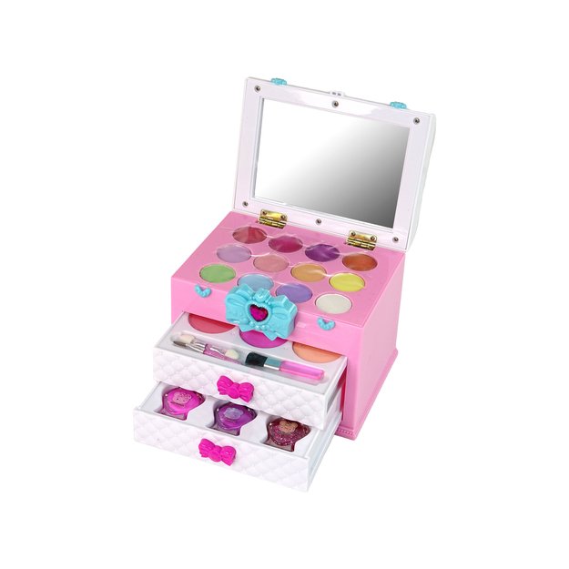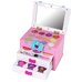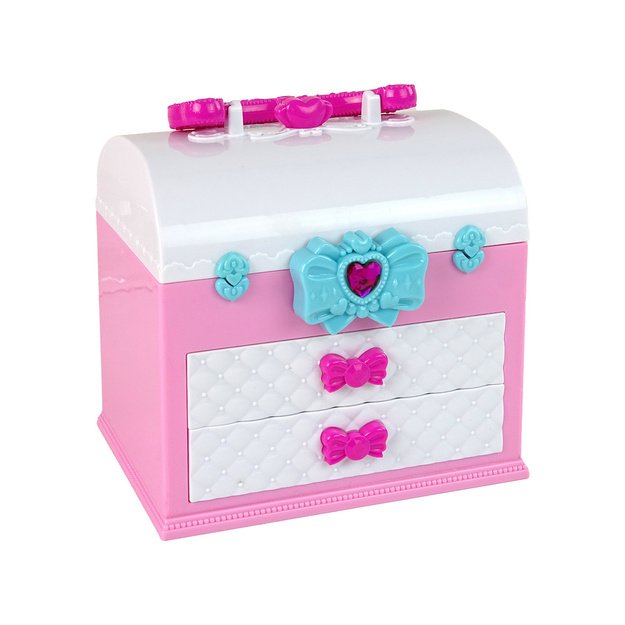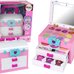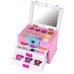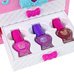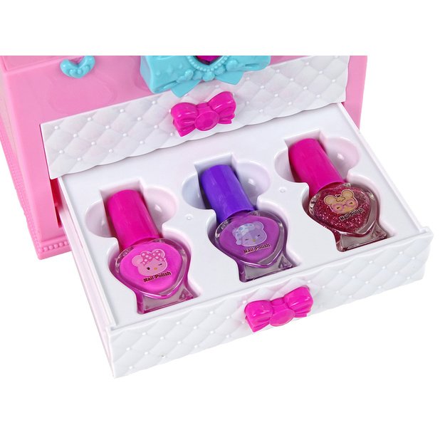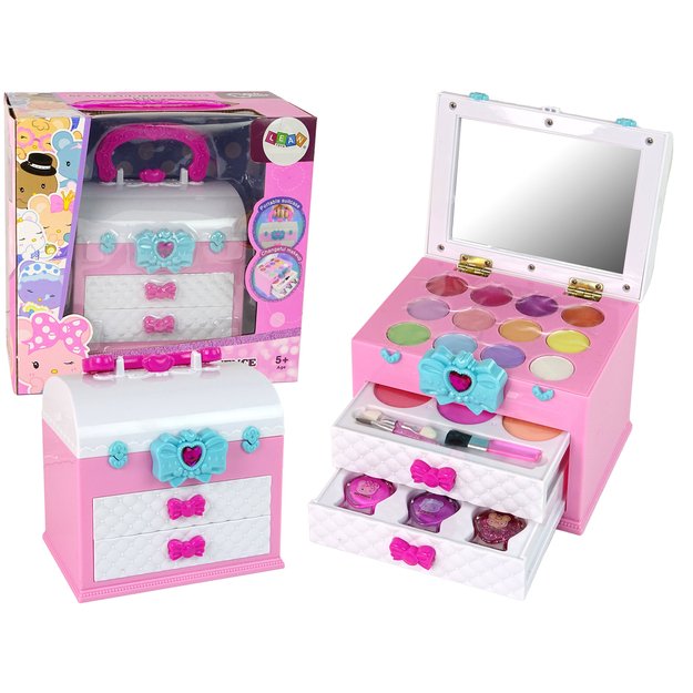 Antrame stalčiuje yra 3 skirtingų spalvų nagų lakai, kurie leis atkurti fantastiškus raštus ant mažųjų pirštukų. Be to, jis taip pat atsidaro iš viršaus, pasukus mėlyną lanką, ir atskleidžia daugiau lobių. Jame yra 4 spalvingi lūpų blizgiai ir net 8 šešėliai, kurie nepakartojamai pagyvins kiekvieną veidą. Taip pat yra žavus veidrodėlis, leidžiantis mažiesiems stilistams pasigrožėti savo darbais. Kufriukas praktiškas, nes turi rankeną, todėl jį galima lengvai perkelti ten, kur vaikas nori pasiimti savo žaislą. Jo matmenys: <gt˙ 14 cm x 20 cm x 10 cm, todėl jis yra praktiškas ir idealiai tinka kelionėms. Komplekto komponentai: - lagaminas - 11 šešėlių - 4 lūpų blizgesiai - 3 teptukai - 3 spalvoti nagų lakai - veidrodėlis Lagaminų matmenys: 14 cm x 20 cm x 10 cm Pakuotės dydis: 24 cm x 23 cm x 13 cm Jis yra sertifikuotas CE ir atitinka EN71 standartą. Žaislas skirtas vyresniems nei 5 metų vaikams.