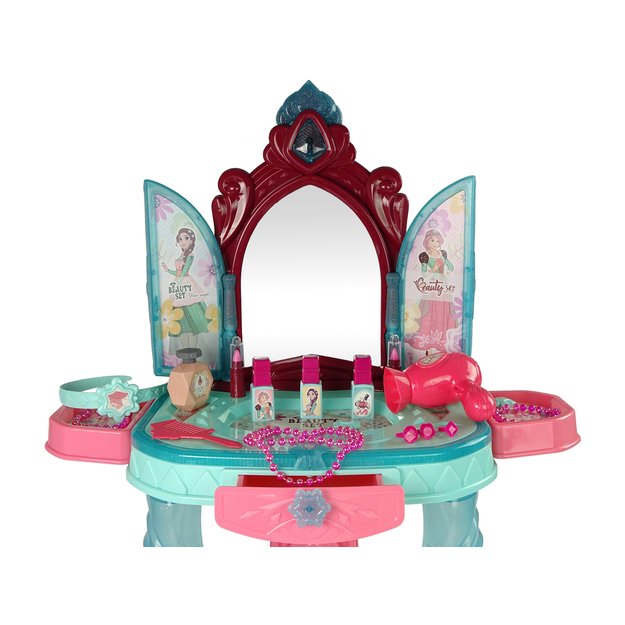 Šis grožio rinkinys - tai gražus mergaitiškų spalvų žaislinis tualetinis staliukas. Jame yra papuošalų stalčius ir didelis trijų dalių veidrodis. Ant šoninių dalių yra princesių atvaizdai. Dabar ir jūsų mergaitė gali tapti princese.