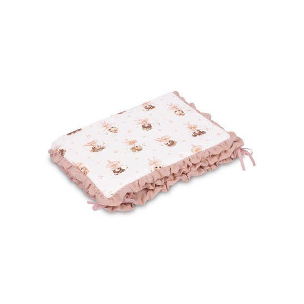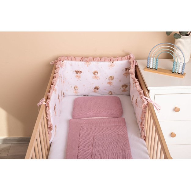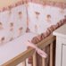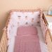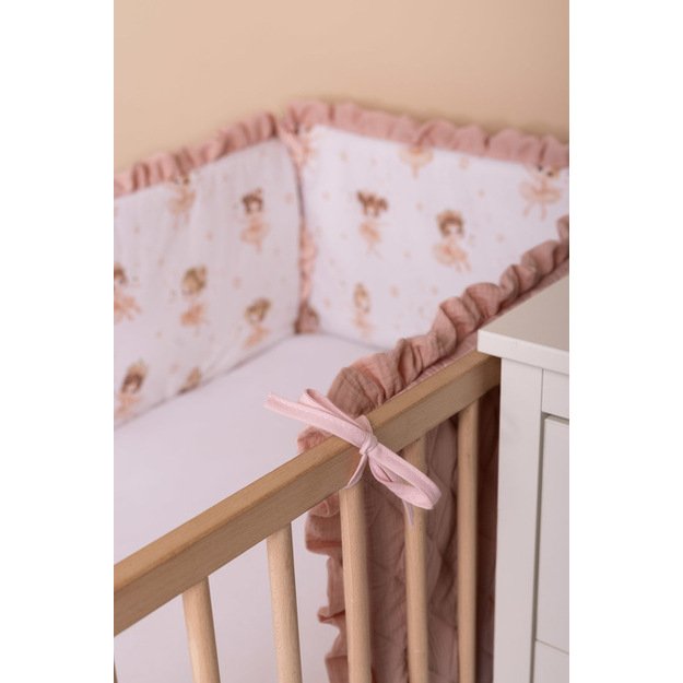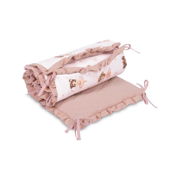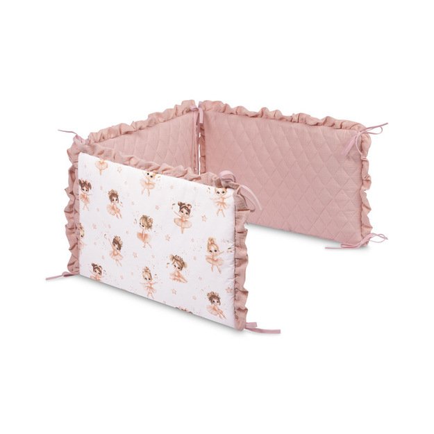 Minkšta apsaugos konstrukcija efektyviai sušvelnina kūdikio atsitrenkimus į lovytės groteles, taip padidindama saugumą tiek miego, tiek žaidimo metu. Viena pusė pagaminta iš švelnios muslino medžiagos, kuri puikiai tinka jautriai kūdikio odai. Kita pusė – lygi medvilnė su švelniu pasteliniu raštu, suteikiančiu lovytei išskirtinumo.
