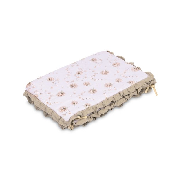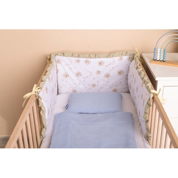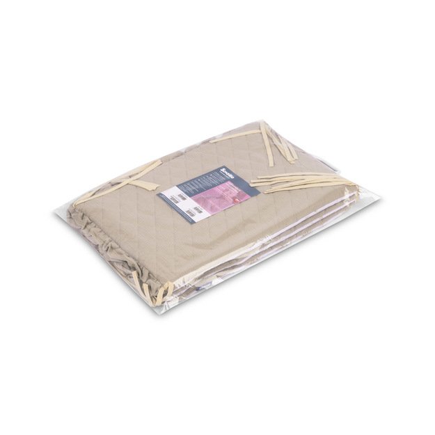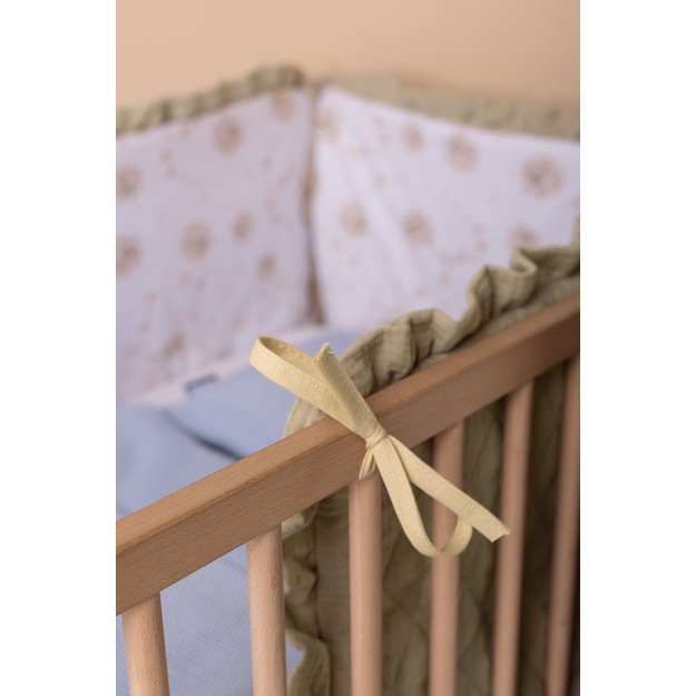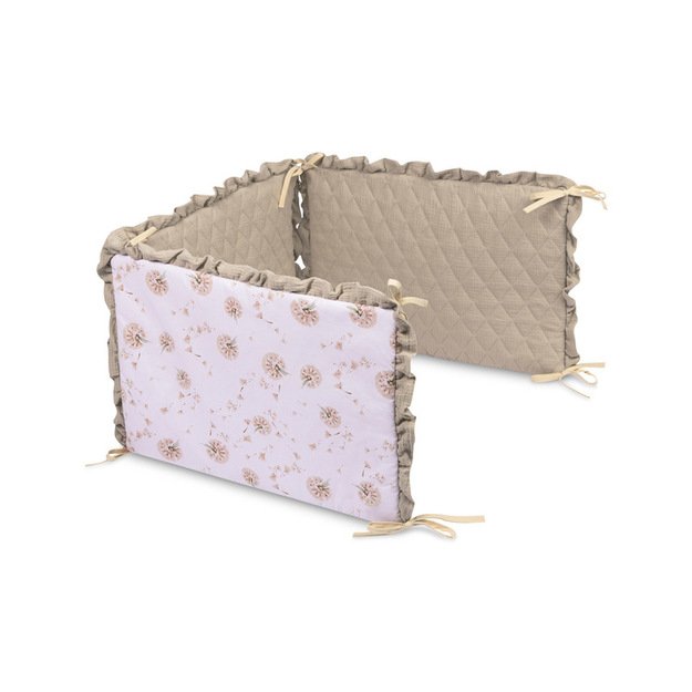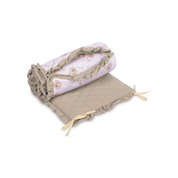 Minkšta apsaugos konstrukcija efektyviai sušvelnina kūdikio atsitrenkimus į lovytės groteles, taip padidindama saugumą tiek miego, tiek žaidimo metu. Viena pusė pagaminta iš švelnios muslino medžiagos, kuri puikiai tinka jautriai kūdikio odai. Kita pusė – lygi medvilnė su švelniu pasteliniu raštu, suteikiančiu lovytei išskirtinumo.