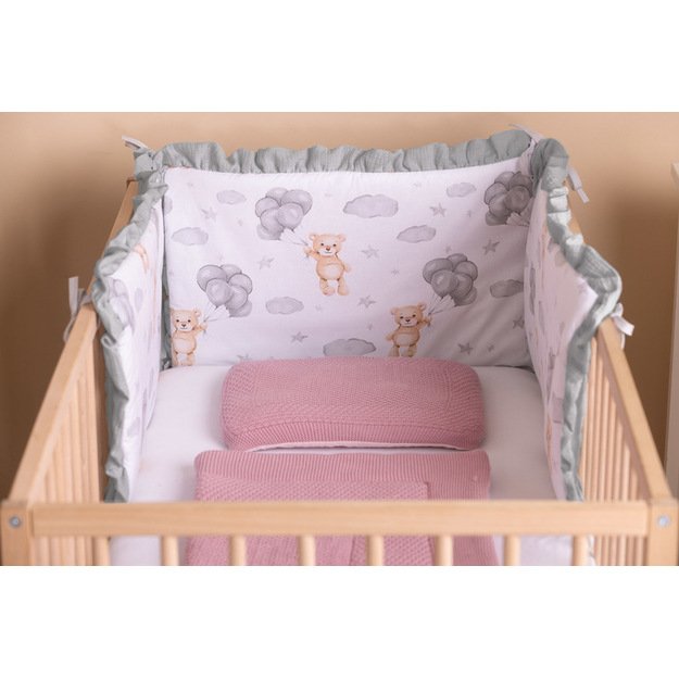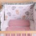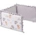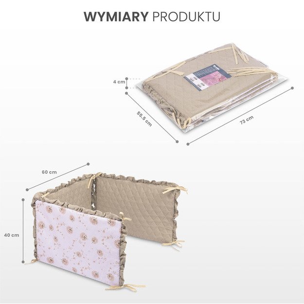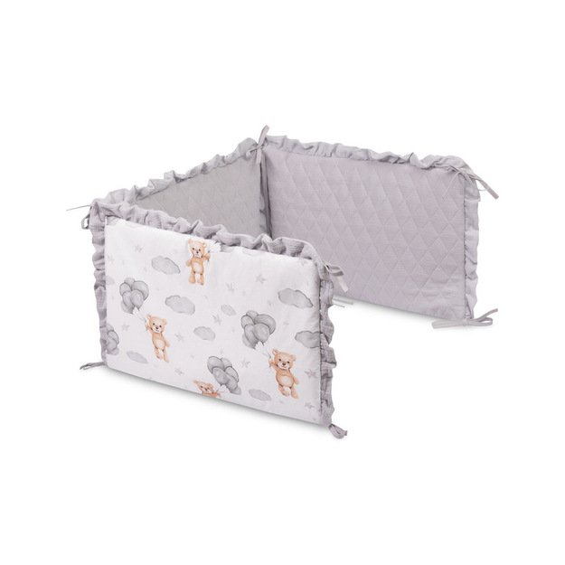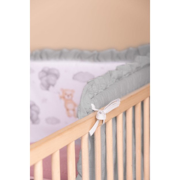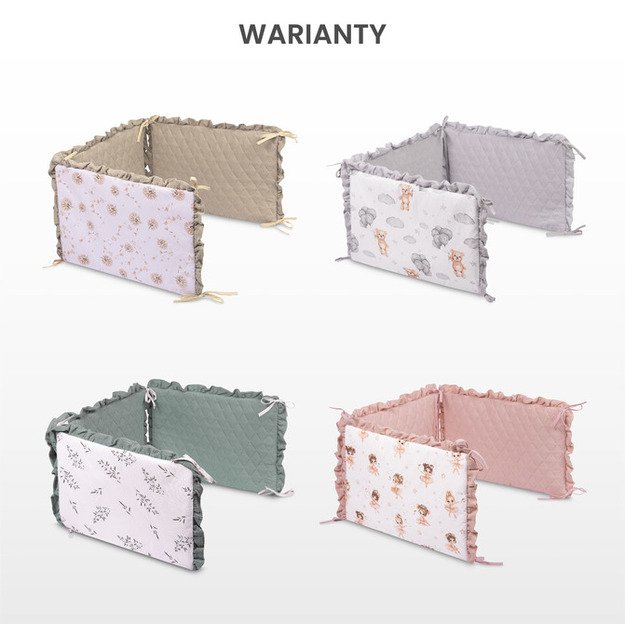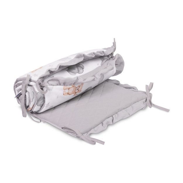 Minkšta apsaugos konstrukcija efektyviai sušvelnina kūdikio atsitrenkimus į lovytės groteles, taip padidindama saugumą tiek miego, tiek žaidimo metu. Viena pusė pagaminta iš švelnios muslino medžiagos, kuri puikiai tinka jautriai kūdikio odai. Kita pusė – lygi medvilnė su švelniu pasteliniu raštu, suteikiančiu lovytei išskirtinumo.