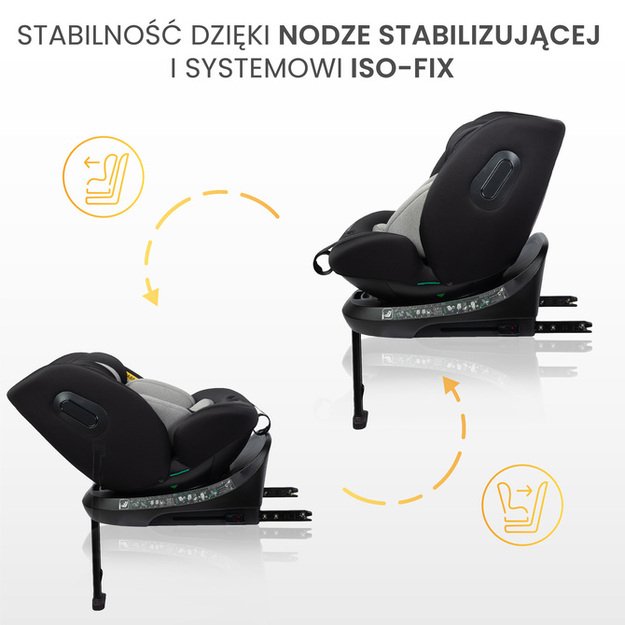 Automobilinė kėdutė greitai ir lengvai montuojama naudojant stabilizuojančią kojelę ir ISO-FIX sistemą. Dėl 360 laipsnių pasukimo funkcijos automobilinę kėdutę lengva nustatyti į priekį. | |