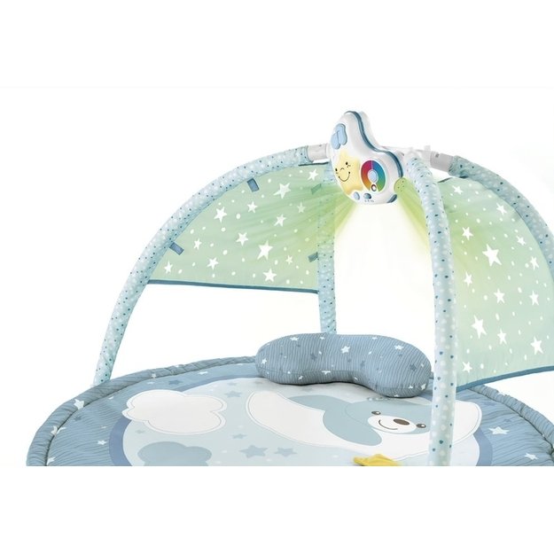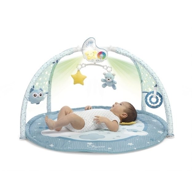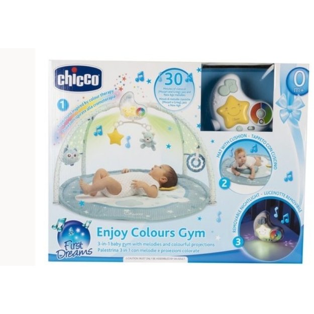 Kūdikių treniruoklis "3 in 1" yra 83 cm skersmens, jame yra pagalvėlės gulimai padėčiai ir projekcijos bei melodijos, kurios kiekvieną akimirką ant kilimėlio padarys ypatingą. Mėnulio formos projektorių ir naktinę lemputę, skirtą lovelės staliukui, galima nuimti. Šiltos spalvos ir džiazo muzika skatins kūdikį žaisti Vėsios spalvos ir klasikinė muzika padės vaikui atsipalaiduoti. Taip pat yra pramoginis režimas, kurį lydi šiltos ir šaltos spalvos su Naujųjų laikų melodijomis. Galite pasirinkti 15 arba 30 minučių muzikos ir šviesos. Spalvinga kūdikių treniruoklių salė su melodijomis ir projekcijomis buvo įkvėpta chromoterapijos.