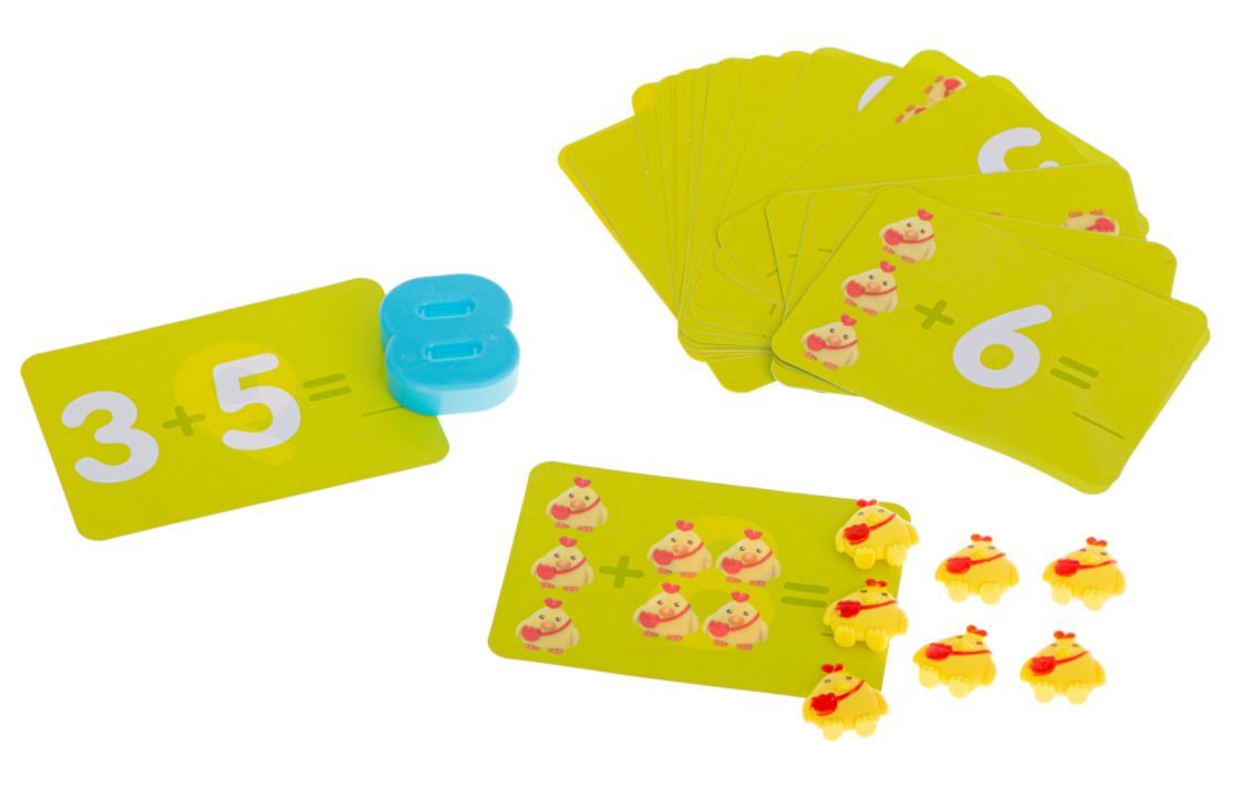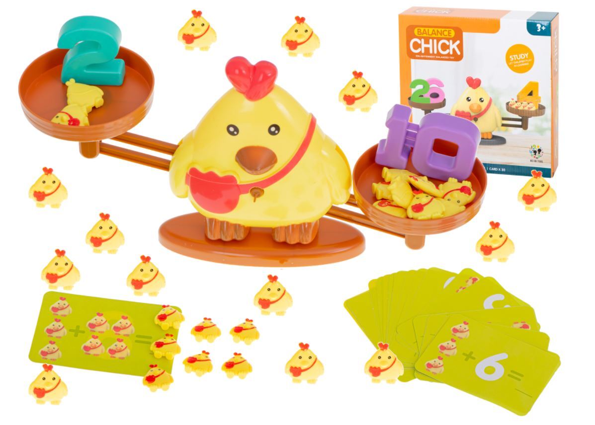 Rinkinyje yra svarstyklės, 19 viščiukų svorių, 10 skaičių ir 30 užduočių kortelių.