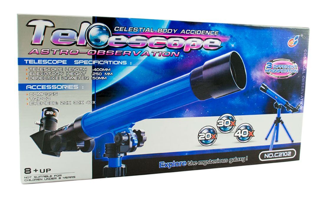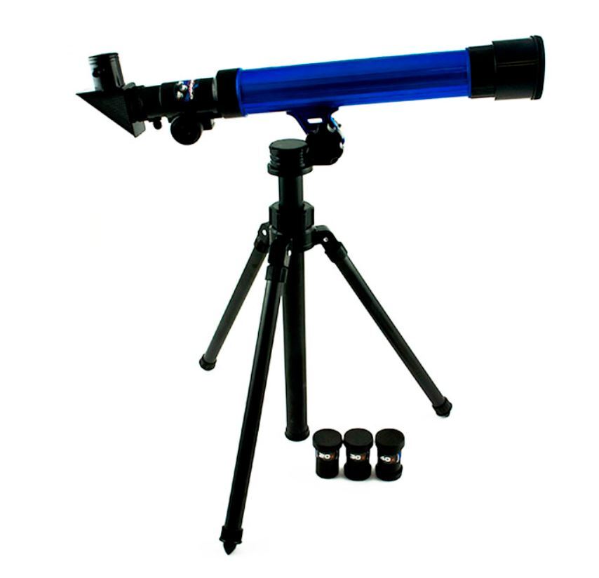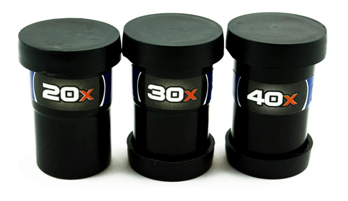 Teleskopas su keičiamais skirtingo galingumo objektyvais (20x, 30x, 40x).