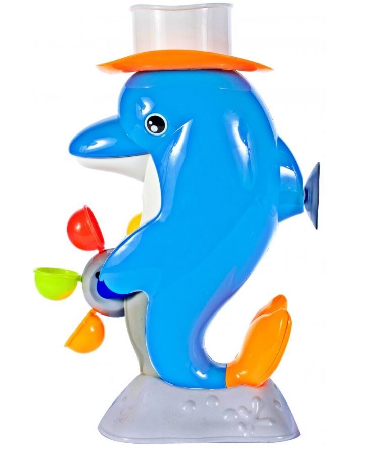 The bath toy is a colorful dolphin, the main principle of which is to pour water.