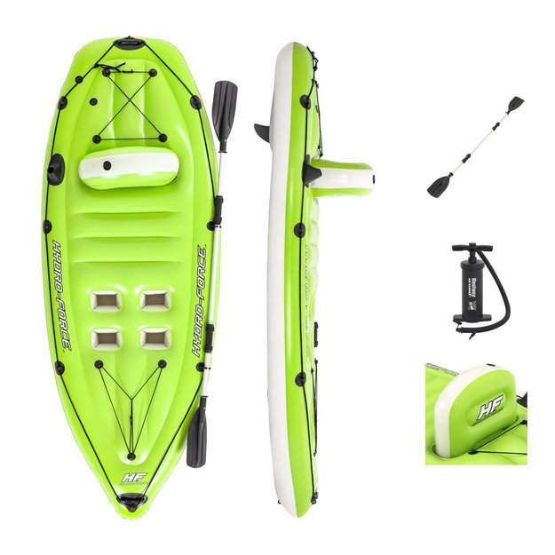 A trip to the water is an ideal form of spending free time. To diversify this carefree time, equip yourself with additional pool accessories. The kayak is intended for fishing on the water. It is also perfect for a recreational trip on the lake or swimming pool. It was made of durable, damage-resistant vinyl. Now you can fish comfortably, complete with a built-in fishing rod holder and oar locks. The kayak also has an inflatable backrest for maximum relaxation and 4 footrests to accommodate users of all sizes. Ideal for transport and compact storage. Additionally, the dorsal fin is detachable, which makes the storage of this kayak even easier. This kit also includes an Air Hammer ™ hand pump for simple, fast inflation, a paddle and a repair patch.