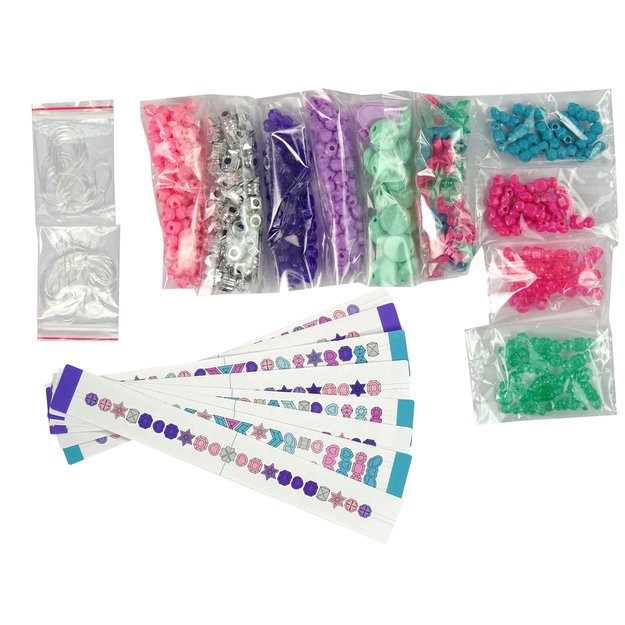 You thread the strings onto the device, then thread the beads one by one, pull them off and the bracelet is ready. Instructions for use are included. Time for super fun!