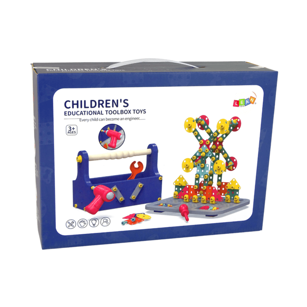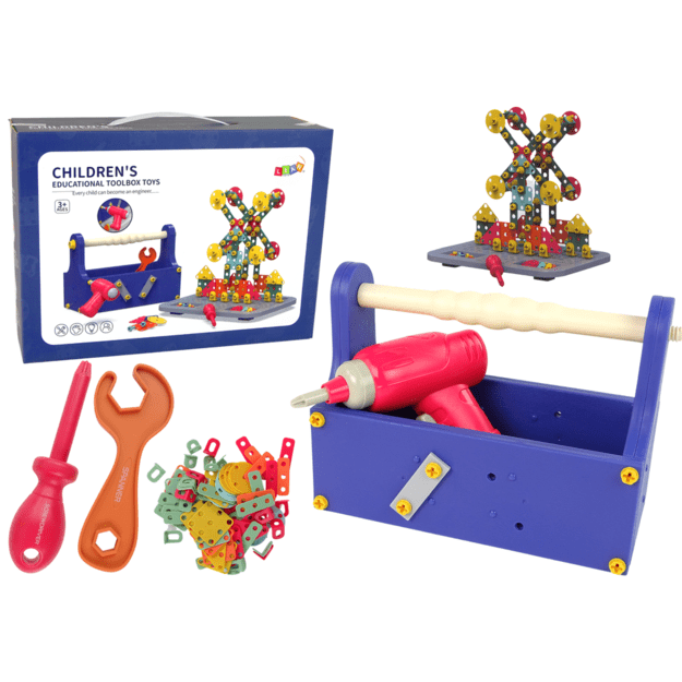 A toolbox is every little DIYer s dream. With this set you will learn to measure, nail. screw, unscrew and drill. The set includes an electric screwdriver with, screwdriver, screws, nails, spanner, flat construction pieces and a screwing board.