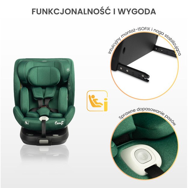 Comfi is a high-quality rotating car seat for children from 40 to 150 cm tall, designed for safe and comfortable travel. Thanks to the rotating seat, you can easily change the direction of the seat, which makes it easier to prepare your child for the journey. 5-step tilt adjustment allows you to comfortably position your child in the seat and makes it easier for them to fall asleep. The Comfi seat is equipped with a memory foam headrest and upholstery that adapts to the shape of the child s head, providing maximum comfort. Ergonomic buttons allow for easy adjustment of the headrest height and belt tension, so the seat can be quickly and conveniently adapted to individual needs. ISOFIX mounting and a support leg guarantee maximum safety and stability. Comfi is equipped with SICT technology, which increases the child s protection in side impacts, reducing the distance between the seat and the interior of the car.