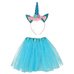 Karnavalinis kostiumas vienaragio galvos juosta ir mėlynas princesės sijonas su blizgančiomis žvaigždutėmis.