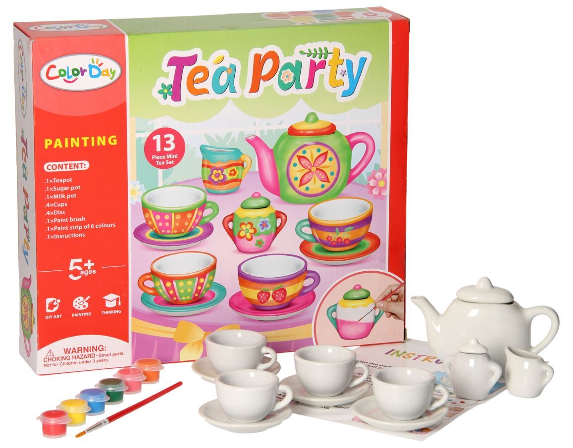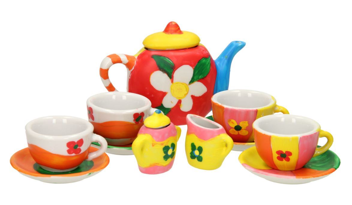 Šį 13 dalių keramikinį arbatos rinkinį galite paversti savo unikaliu kūriniu! Dažykite stalo įrankius mėgstamomis spalvomis su šešių skirtingų spalvų dažais ir teptuku.