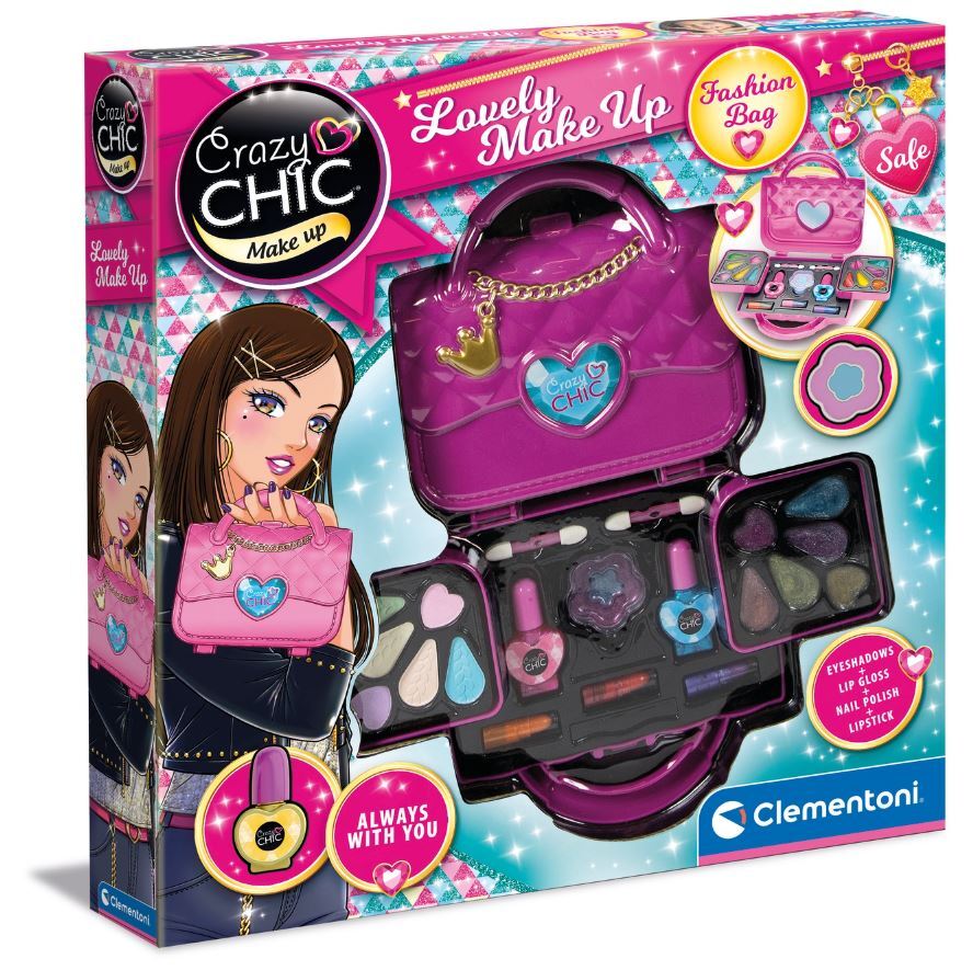 - Auksinė karūna, Crazy Chic makiažo asortimento tendencijos ikona ir madingas maišelio dizainas daro šį makiažo dėklą praktišką, lengvai transportuojamą ir itin geidžiamą mažoms mergaitėms.