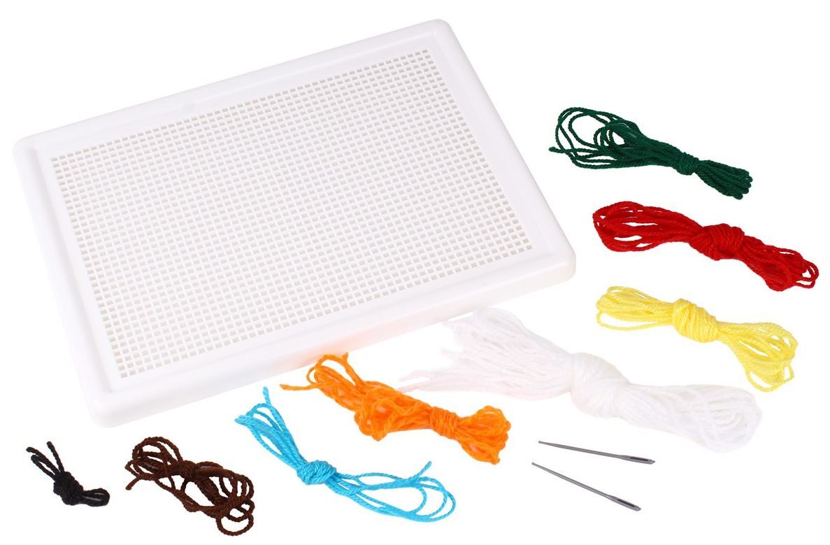 Rinkinyje: plastikinis rėmelis - 1 vnt., adatos siuvinėjimui - 2 vnt., spalvoti siūlai pagal schemą. Vaikams nuo 6 metų.