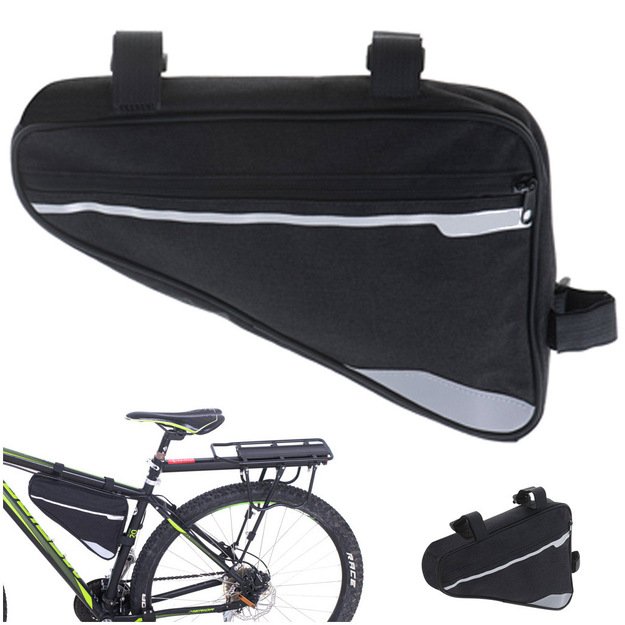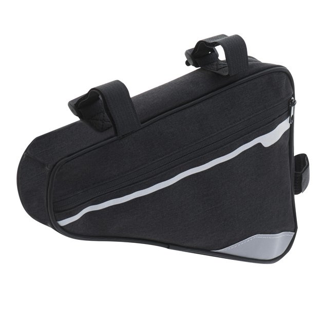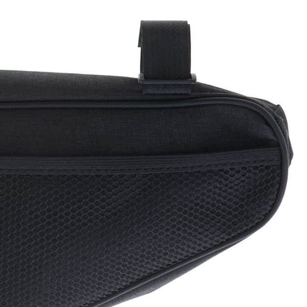 Praktiška dviračių dėtuvė po dviračio rėmu. Puikiai tinka visiems būtiniems smulkiems priedams nešiotis. Užsegimas užtrauktuku užtikrina nešiojamų daiktų saugumą. Montuojamas su Velcro dirželiais. Medžiaga: poliesteris. Matmenys: 30 x 21 x 5 cm.