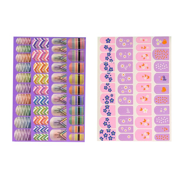 Įvairiaspalvis nagų lako rinkinys su įvairiais spalvingais lipdukais. Klasikiniai, raštai ir blizgučiai leis gražiai nudažyti nagus ir greitai bei neinvaziniu būdu juos nuimti įprastu nagų lako valikliu.