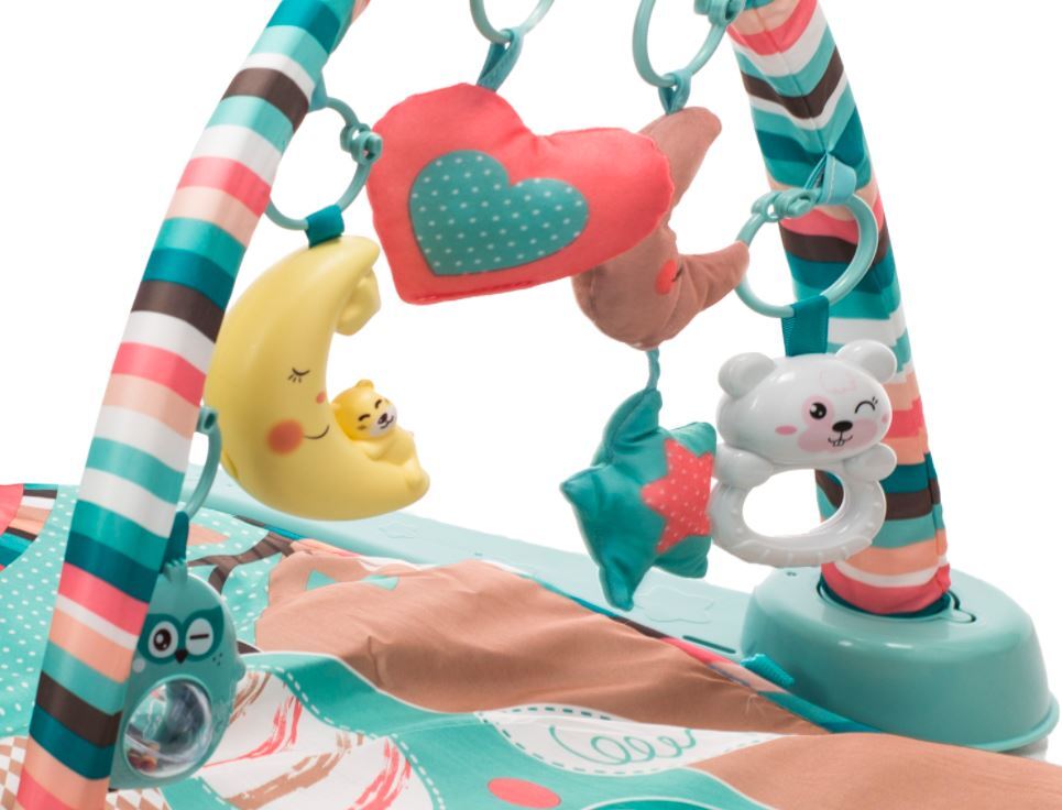 Pritvirtinti minkšti žaislai ir ryškių spalvų plastikiniai barškučiai paskatins mažylį žaisti. Jie taip pat stimuliuos pojūčius ir palaikys vaiko motorikos vystymąsi.