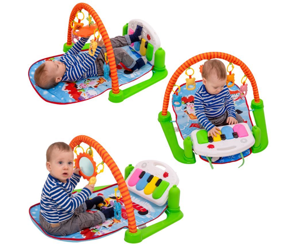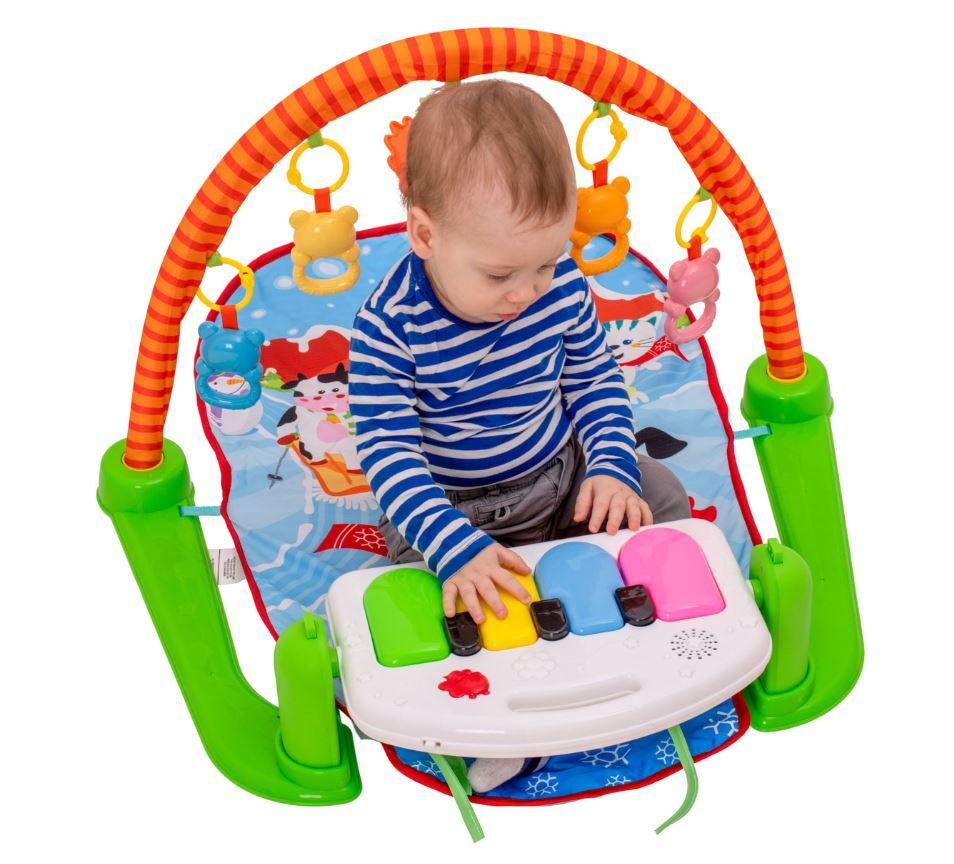 Mokomasis kilimėlis su veidrodžiu ir pakabučiais. Komplekte yra fortepijonas, grojantis 10 skirtingų melodijų.