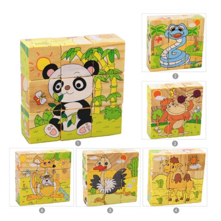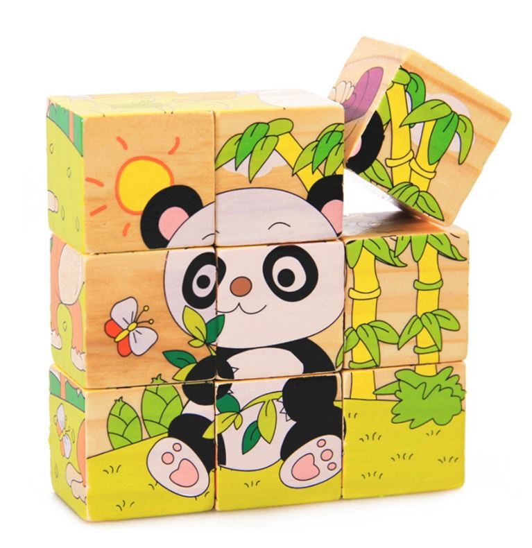 Rinkinyje yra 9 kubeliai, iš kurių galite sukurti 6 didelius spalvotus paveikslėlius.