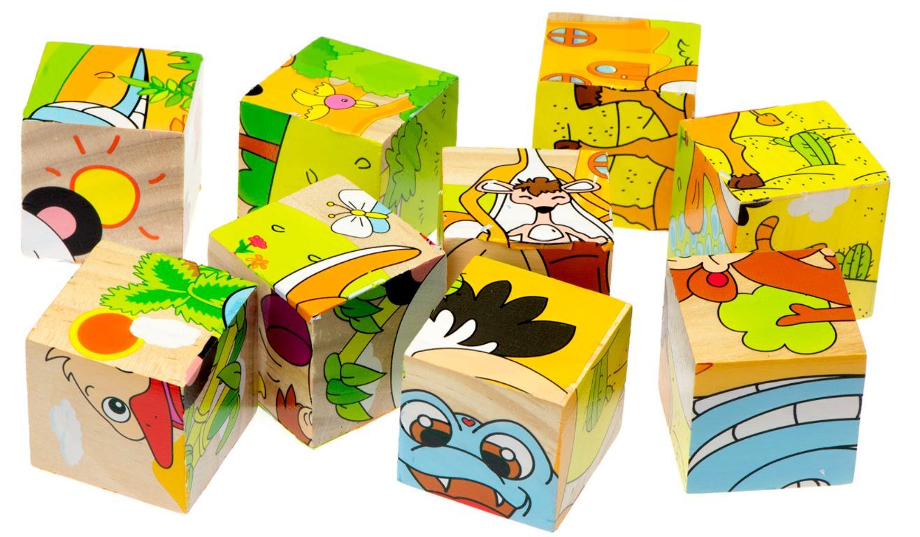 Rinkinį sudaro 9 vienodo dydžio mediniai, spalvoti kubeliai.
