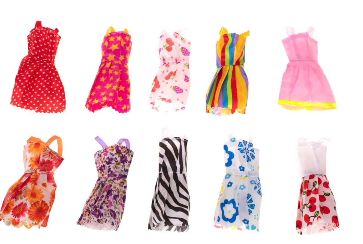 Spalvingi drabužiai ir aksesuarai, tinkantys lėlėms.