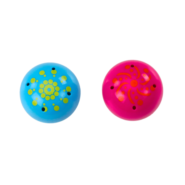 Rinkinyje yra du 4,5 cm skersmens kamuoliukai, kurių dydis puikiai tinka mažoms vaiko rankutėms, todėl juos lengva paimti ir valdyti. Žaislas pasižymi prislopintomis, pastelinėmis spalvomis, kurias vaikai mėgsta, ir intensyviomis kai kurių elementų spalvomis, kurios patraukia jų dėmesį.