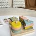 Šiame rinkinyje rasite lentą su 4 stiebeliais ir 4 rūšių geometrines formas su skylėmis viduryje. Kvadratai, stačiakampiai, trikampiai ir apskritimai yra nudažyti skirtingomis šviesiomis pastelinėmis spalvomis.