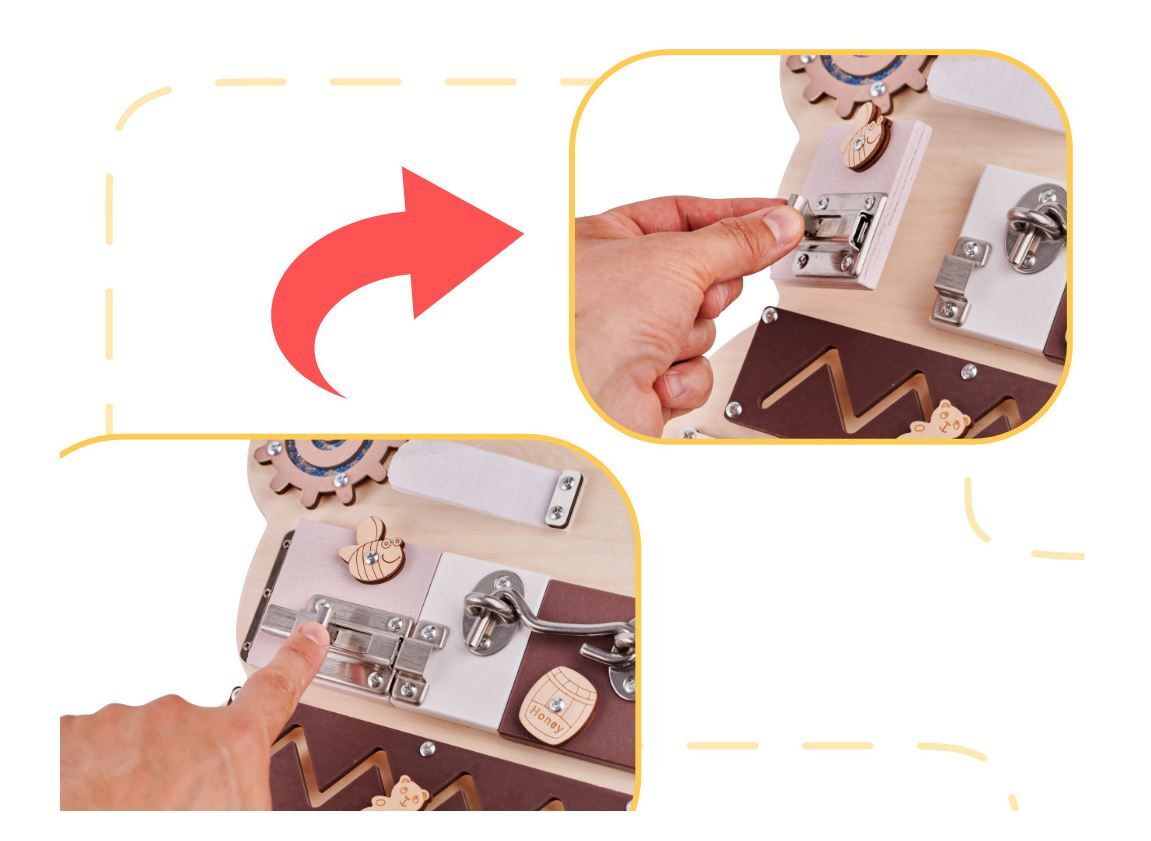 Vaikams skirta manipuliavimo lenta pagaminta atkreipiant dėmesį į kiekvieną smulkmeną, visi elementai kruopščiai nušlifuoti taip, kad žaidžiant skeveldra neliptų į rankas. Be to, jame nėra aštrių elementų.