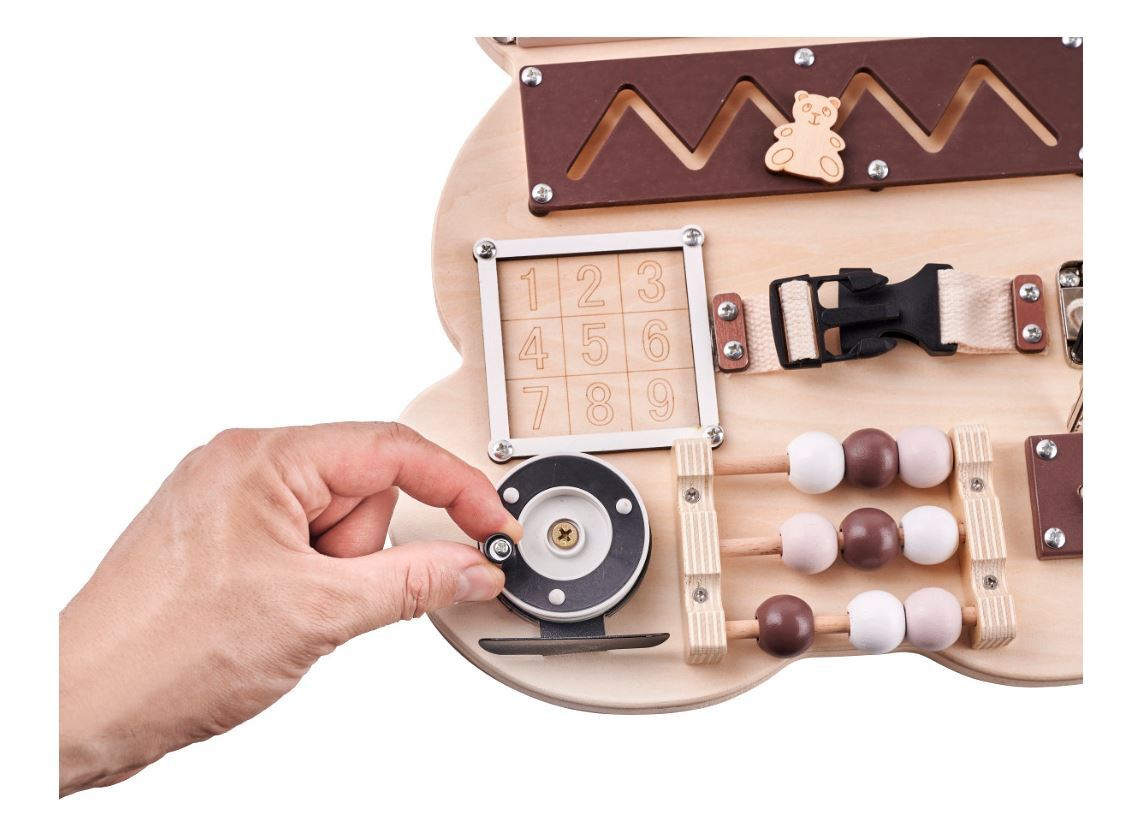 Jutiminė valdymo lenta meškiuko formos. Joje yra daug įvairių veiklų, kurių dėka vaikas lavins rankinius įgūdžius.