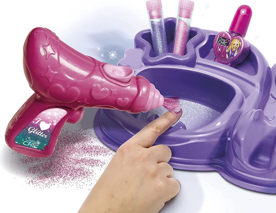 Jame yra blizgučių purškimo mašina ir daug spalvotų blizgučių – tobuli nagai amžinai! Įkvepia mažųjų nagų meistrų kūrybiškumą ir vaizduotę.