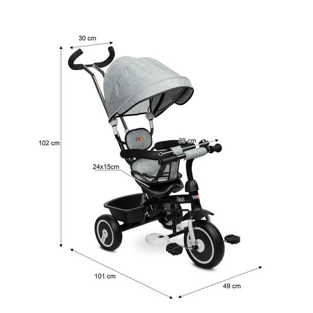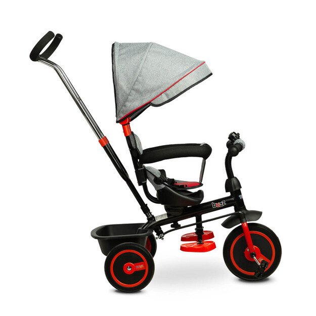 Dviratis BUZZ yra vienas iš daugelio mūsų novatoriškų sprendimų, kurie sujungia triratuką ir vežimėlį. Dviratukas turi diržus ir erdvų, sulankstomą stogelį, kuris apsaugo mažylį nuo saulės. Į galinėje dalyje esantį krepšį galima įdėti įvairių smulkių mažylio daiktų ir žaislų arba pirkinių krepšį. Dviratukas turi 3 pakopų kojų atramos aukščio reguliavimo funkciją ir laisvąjį ratuką. Tėvams patogu, kad galima reguliuoti rankenos aukštį.