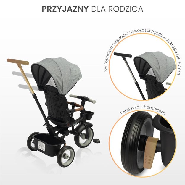 PARENT FRIENDLY Visišką transporto priemonės kontrolę užtikrina papildomi, nepriklausomi kojiniai stabdžiai, esantys gale. Trijų pakopų rankenos aukščio reguliavimas (88-97 cm) suteikia tėvams patogumo, nes jie gali reguliuoti nustatymus pagal savo ūgį. | ||