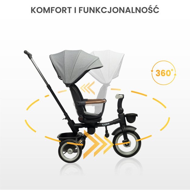 KOMFORTAS IR FUNKCIONALUMAS Pasukama sėdynė su galimybe beveik visiškai atlošti atlošą užtikrina komfortą pasivaikščiojimų metu. Be to, dvi praktiškos daiktadėžės — dviračio priekyje ir gale — padidina jo funkcionalumą. | ||