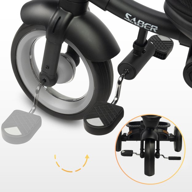 SAUGUMASSaber kompanijoje komfortas ir saugumas yra prioritetas. Trijų taškų saugos diržai ir apsauginis baras užtikrina saugų žaidimą ir ramų vaiko miegą pasivaikščiojimų metu. Šviesą atspindintys lipdukai ir priekinis LED žibintas pagerina matomumą vakarinių pasivaikščiojimų metu. | ||