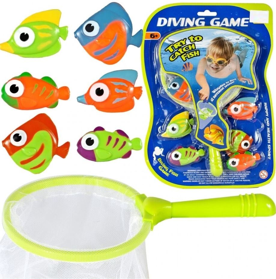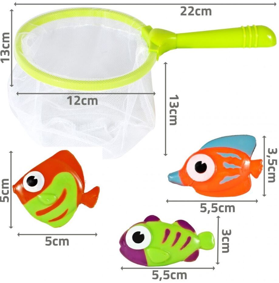 Komplektas su spalvingomis žuvytėmis paįvairins kiekvieną vonią. Plastikinis sietelis su minkštu tinklu žvejybai leis sugalvoti įvairias vandens istorijas, gaudyti žaislus, žaisti.