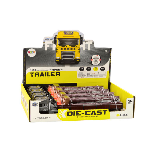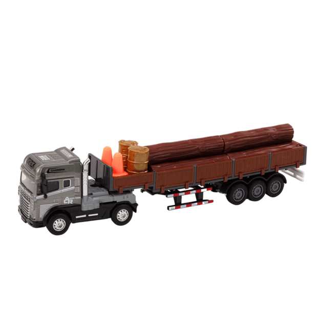 1:24 mastelio sunkvežimio su priekaba modelis yra universalus ir tikroviškas žaislas, kuriame funkcionalumas derinamas su tikslia tikros transporto priemonės reprodukcija. Dėl pilkos kabinos, rudos priekabos su nuimamais šonais, pavaros, nuimamos priekabos ir garso bei šviesos efektų vaikai gali lavinti vaizduotę ir mokytis logistikos bei eismo saugumo principų. Krovinys kūgių, statinių ir medienos rąstų pavidalu papildomai padidina žaidimo patrauklumą ir mokomąją vertę.
