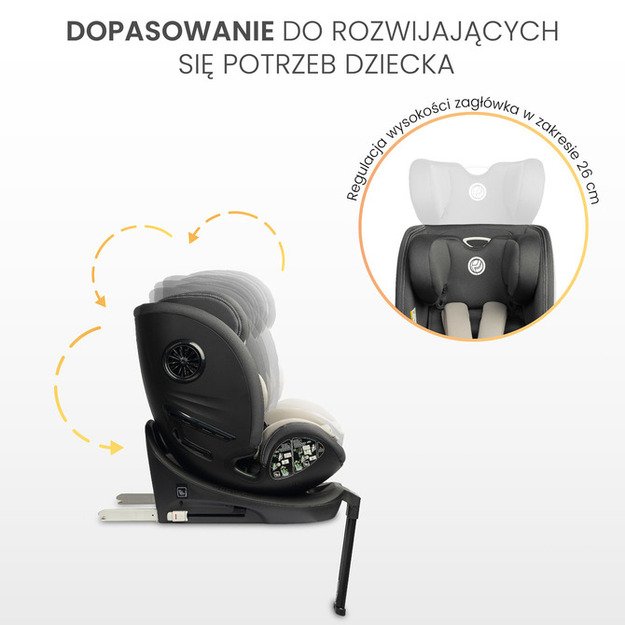 Fortis is a car seat for children with a height of 40 cm to 150 cm, which will provide comfort from the first moments of the child s life. Fortis meets i-Size approval standards, guaranteeing travel with the highest safety standards. Equipped with a stabilizing leg, it can be mounted in a car using ISOFIX hooks. The seat is equipped with an integrated button that is also responsible for adjusting the inclination and rotating the seat 360 degrees, thanks to which you can quickly and conveniently protect your child before traveling. The Fortis seat is adapted to the needs of children from the first months of life, accompanying them until they no longer require a seat. Comfort and convenience of traveling are ensured thanks to the ergonomically designed insert. The seat upholstery is made of soft-to-touch polyester fabric. Multi-stage headrest adjustment up to 26 cm ensures maximum comfort during travel, and a set of reducing inserts will help you place your child correctly in the seat. Fortis also has a four-step tilt adjustment, both in the forward and rear-facing position, which allows you to adjust the seat to the child s individual preferences and needs during travel. An additional advantage are the side vents, which will help in proper air circulation near the child s skin.