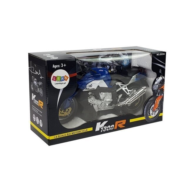 The motorcycle has a streamlined shape, small wheels are mounted on the side, which ensure stability and the toy is kept upright. A wheel is mounted on the bottom of the toy, which allows for quick maneuverability, which is a big plus when playing racing.