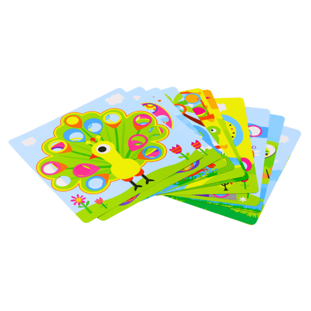 Develop your child s creativity and manual skills with our unique set of picture puzzles! The set contains 12 pictures with holes for colorful buttons and 46 colorful buttons that can be freely arranged to create your own compositions. Each picture is a new adventure that allows your child to explore and match.
