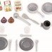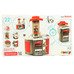 22 priedai (2 puodai, 2 lėkštės, 2 lėkštės, 2 šakutės, 2 peiliai, 2 šaukštai, 2 puodeliai, 2 stiklinės, 3 kapsulės, 2 virtuvės reikmenys, 3 maisto produktai. Visi priedai pagaminti iš plastiko ir (arba) kartono)