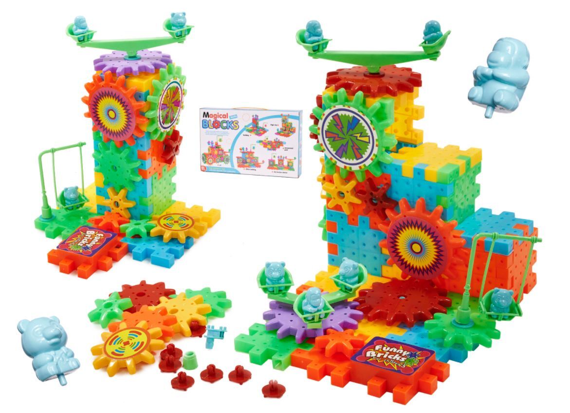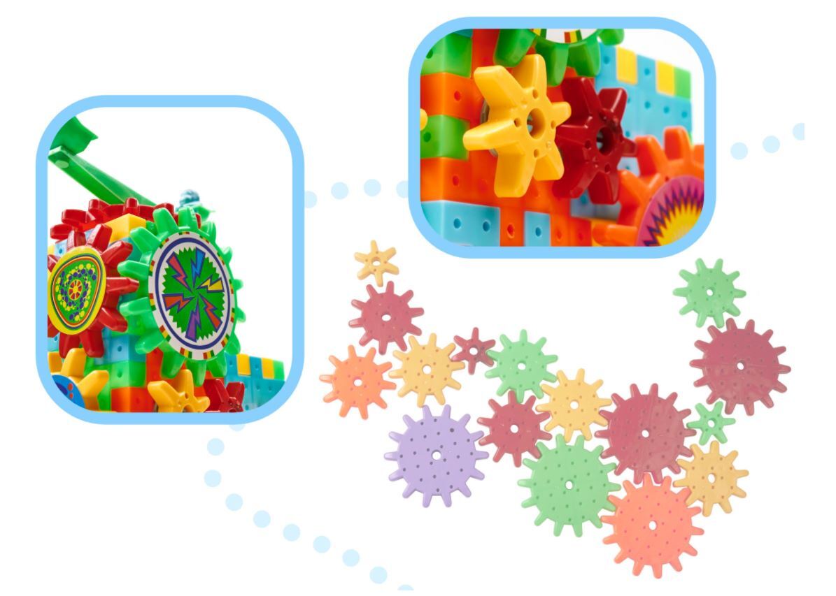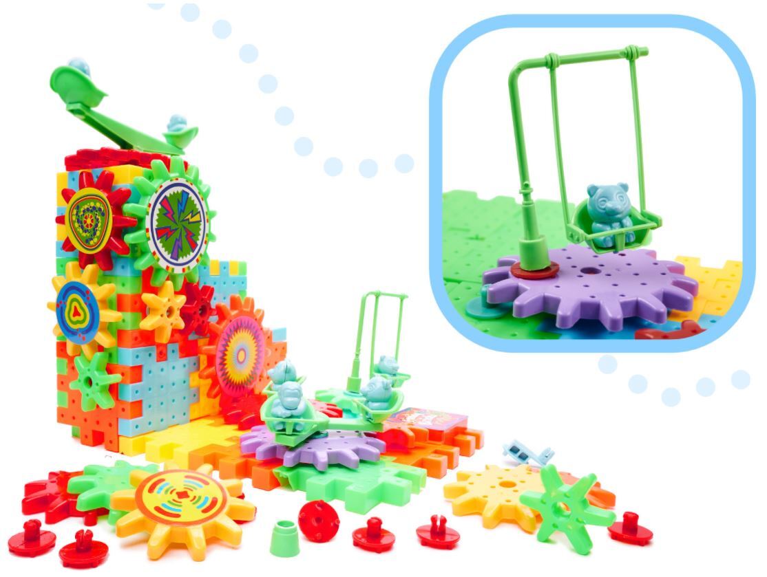 Dėl krumpliaračių pavidalo blokų tai bus stebuklinga žaidimų aikštelė! Pavaros sukurs tarpusavyje varančių elementų mechanizmą.