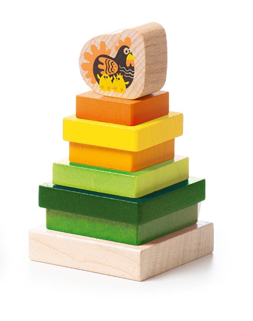 Piramidė susideda iš 8 skirtingų spalvų medinių kaladėlių.