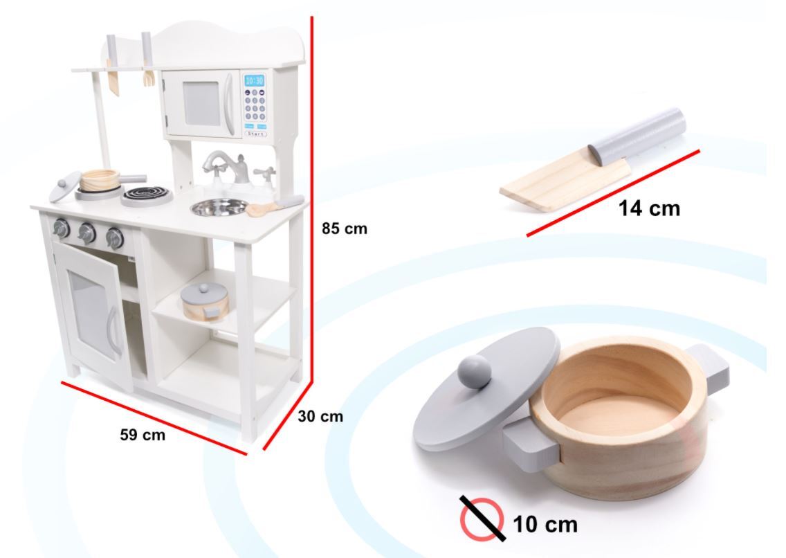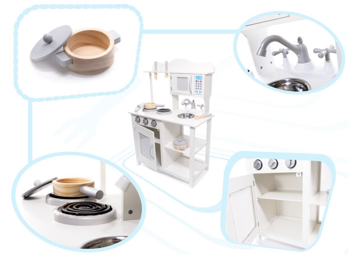 Fantastiška, medinė virtuvė su priedais, skirta savarankiškam surinkimui. Turi atidaromus ir kilnojamus elementus. Ideali įranga vaikų kambariui.