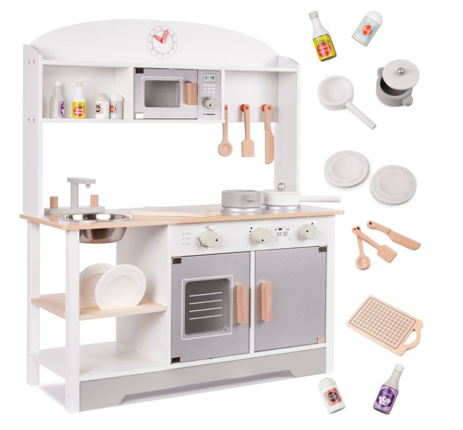 Moderni medinė virtuvė su priedais. Joje rasite įvairių medinių priedų. Tai išmokys vaiką organizuoti ir naudoti virtuvės įrankius, be to,virtuvėlė papuoš kiekvieną kambarį.