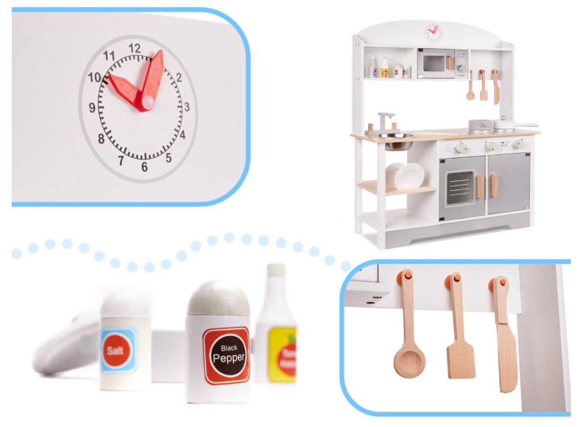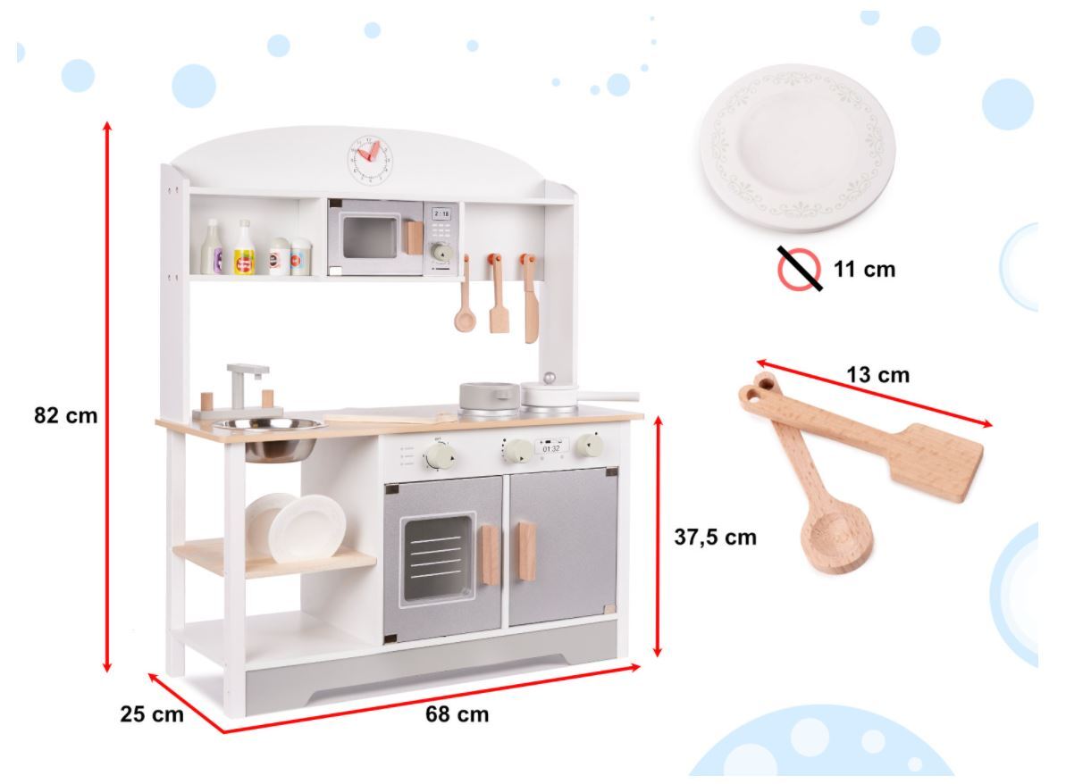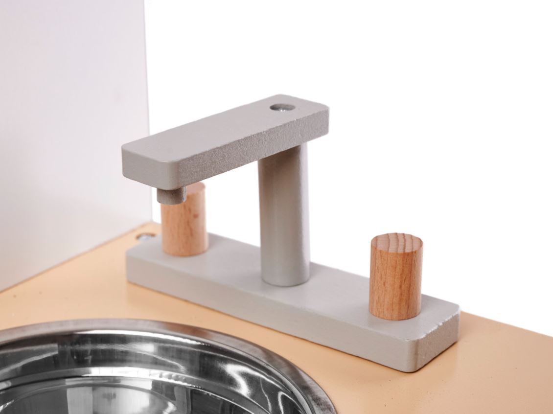 Visi elementai (išskyrus kriauklę) yra pagaminti iš medžio. Visa tai buvo kruopščiai nušlifuota ir padengta netoksiškais dažais - visa tai dėl jūsų vaikų saugumo.