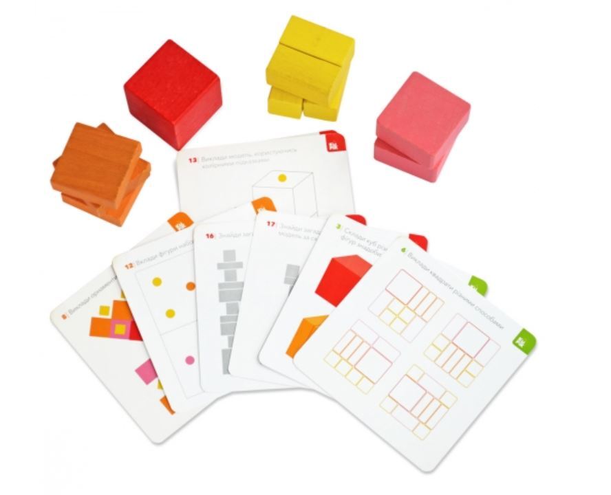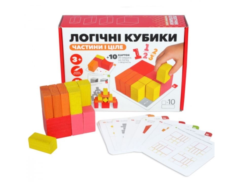 • 10 dvipusių kortelių su loginėmis užduotimis, galvosūkiais, 3D modeliais bei raštais. Puikus būdas paaiškinti paprastus matematinius dėsnius, įskaitant ir trupmenas. Juk daugelis daiktų (pica, obuolys, saldainiai) gali būti ne tik sveiki, bet ir padalinti į lygias dalis: dvi (pusė), tris (trečdalis), keturias (ketvirtadalis). Žaislas lavina formos bei erdvės supratimą, smulkiąją motoriką, loginį mąstymą, kantrybę ir judesio koordinaciją.