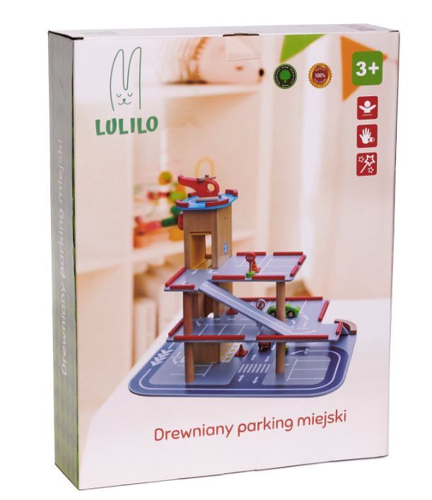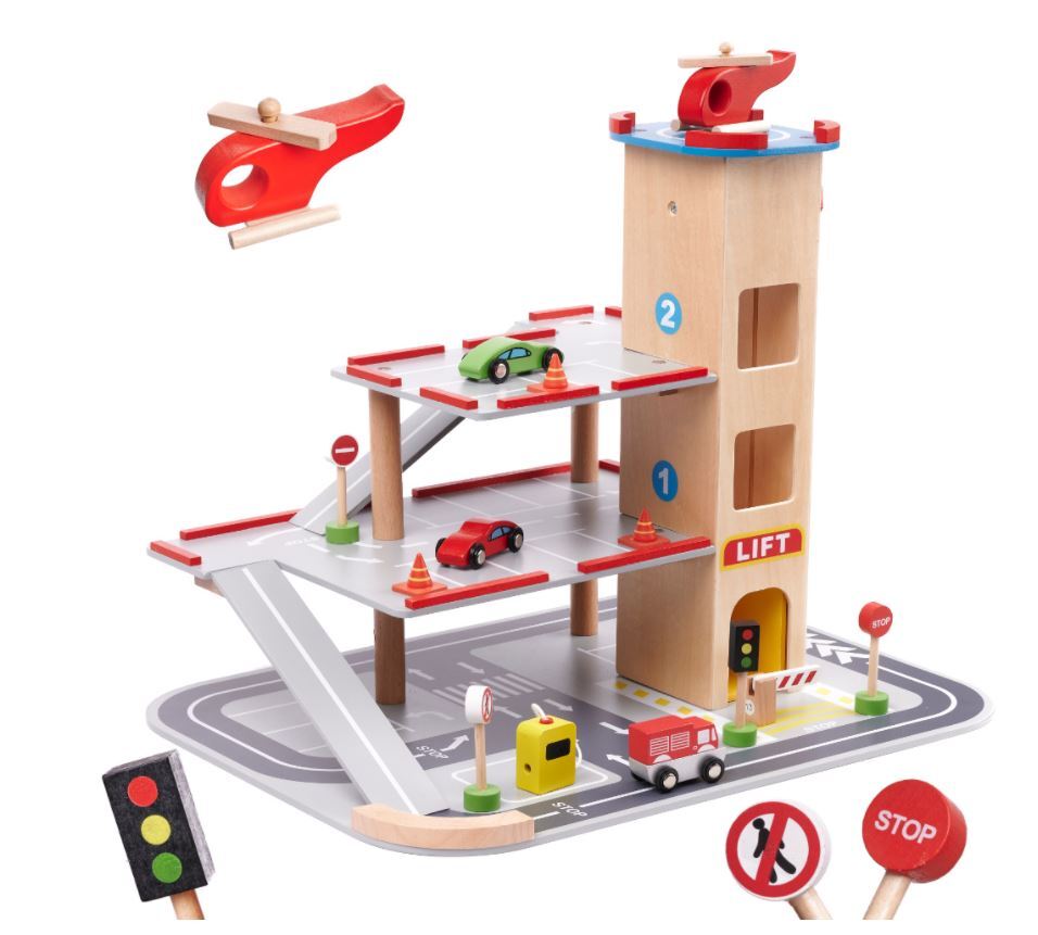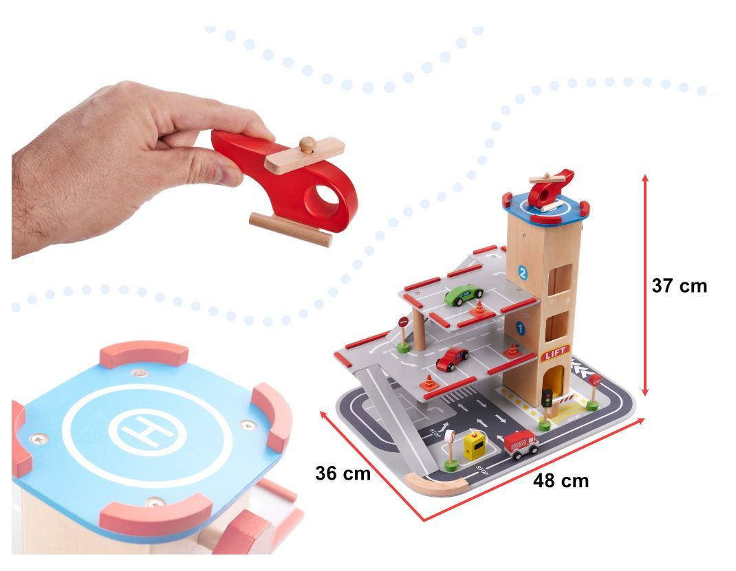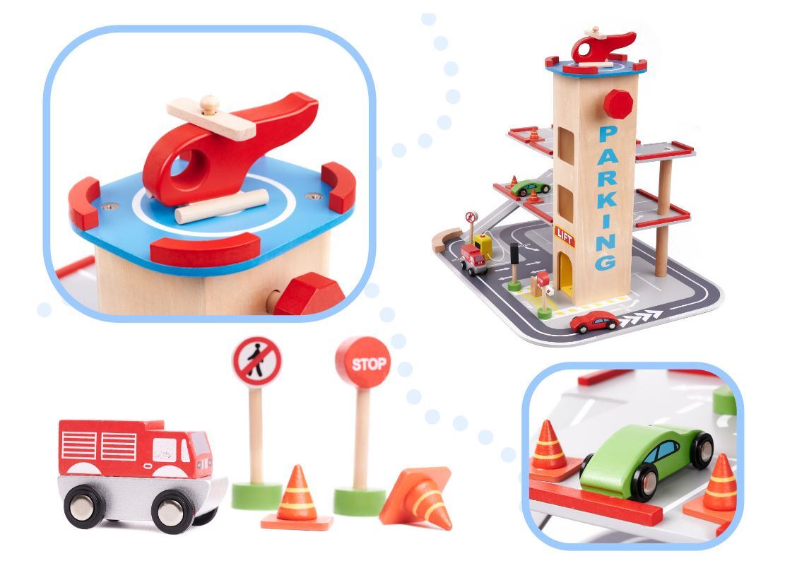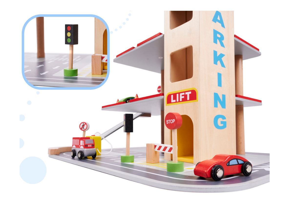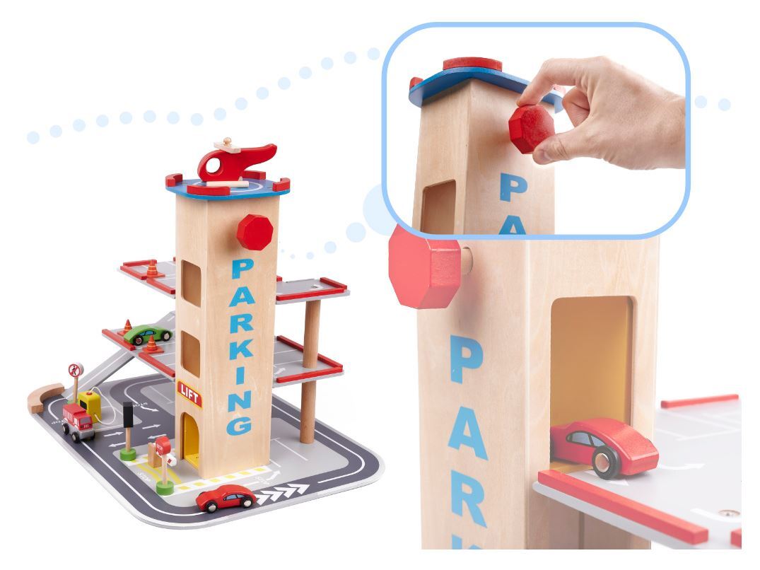 Gražus medinis miesto garažas turi keturis lygius! Pirmosios trys skirtos automobiliams – čia atsiras vietos komplekte esantiems mediniams automobiliams, taip pat daugeliui kitų Jūsų vaiko transporto priemonių. Į kitus aukštus juos pakels liftas!
