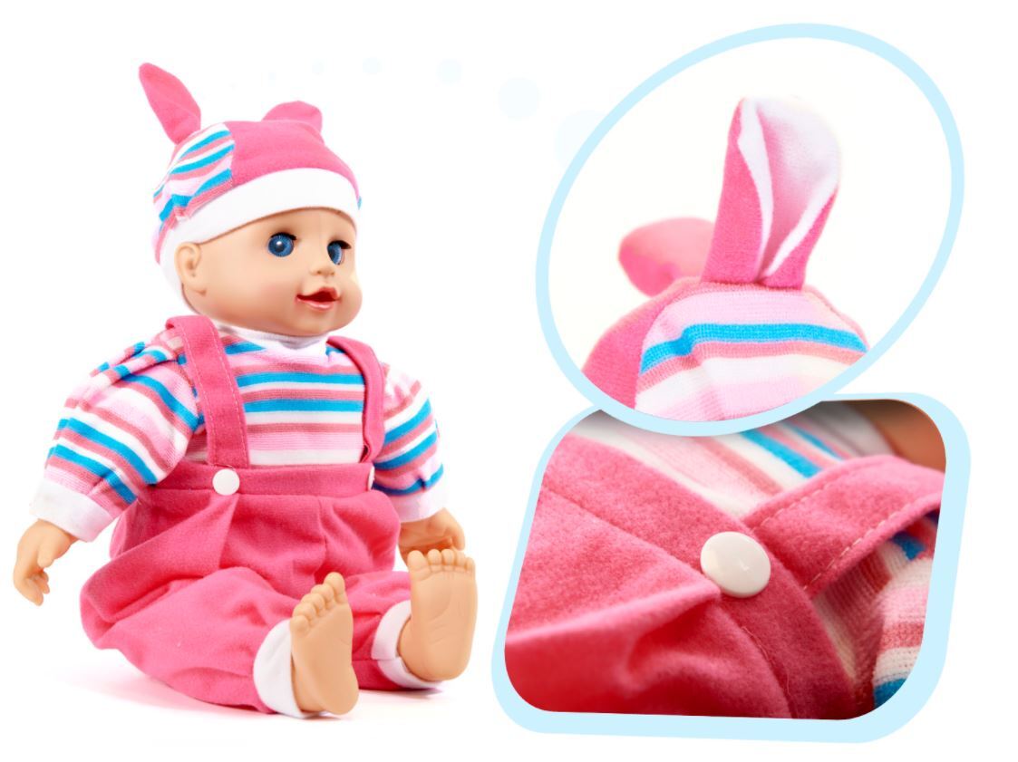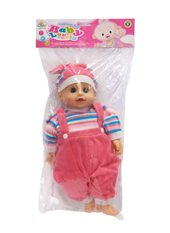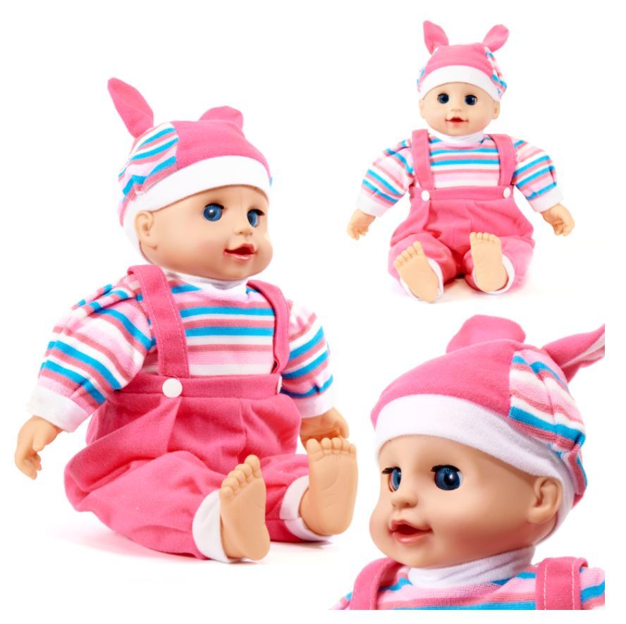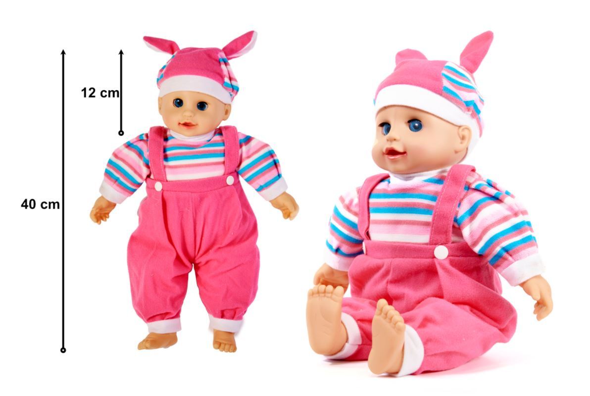 Ši įspūdingo dydžio lėlė atrodo kaip tikras kūdikis. Paspaudus pilvuką,skleidžia garsus,sako mamą,tėtį! Paguldyta verkia ir užsimerkia. Be galo minkšta ir miela lėlytė, patiks kiekvienai mergaitei. Apsirengusi rožiniu kostiumėliu ir dryžuota palaidine. Galvą puošia dryžuota kepuraitė. Tai visų mergaičių svajonė, tapti šio kūdikio mamytėmis.